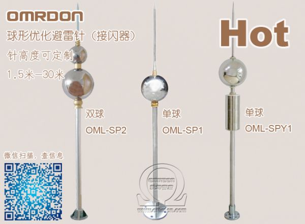 歐姆雷盾(OMRDON)系列球形優化避雷針(又名接閃器、接閃桿),其原理就是利用尖端放電現象,在雷電發生時,避雷針成為吸引雷電的放電通道,讓雷電電流從避雷針流入大地,避免巨大的電流對建筑或設備造成破壞。球形優化避雷針是一條無感性低阻抗的金屬內導體,采用電離球的電場原理可以有效、快速的通過引下線,把接閃后的雷電電流輸送到大地,球形優化避雷針最大特點覆蓋面積大,泄放雷電能力強。