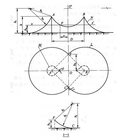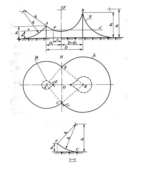 2 B、E接閃桿連線上的保護范圍見圖D.0.4中1-1剖面圖,外側部分應按單支接閃桿的方法確定。兩桿間的保護范圍應按下列方法確定: