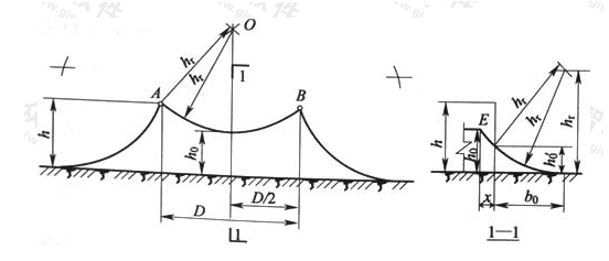 7)接閃線兩端的保護范圍按兩支高度hr的接閃桿確定,但在中線上h0線的內移位置按以下方法確定(圖D.0.6-2的1-1剖面):以兩支高度hr的接閃桿所確定的保護范圍中點最低點的高度