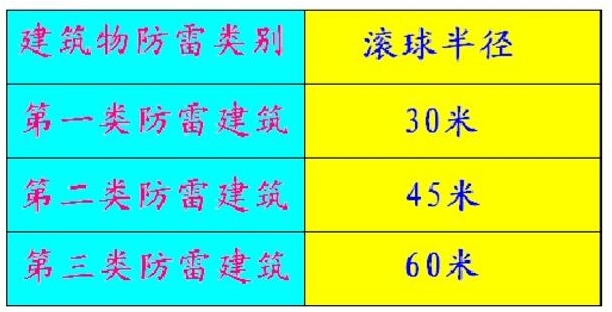 接閃器(避雷針,避雷線,避雷帶,避雷網(wǎng))的防護(hù)范圍一般用滾球法明確定,不同的防雷等級所用的半徑不同,如下圖所示