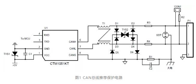 許多應(yīng)用要求滿足IEC61000-4-2靜電放電4級,IEC61000-4-5浪涌抗擾4級要求。一般的收發(fā)器ESD、浪涌的防護(hù)等級均比較低,如CTM1051M隔離CAN收么器的隔離耐壓為2500VDC,裸機(jī)情況下,ESD、浪涌等級均較低,所以有必要增加外圍電路。