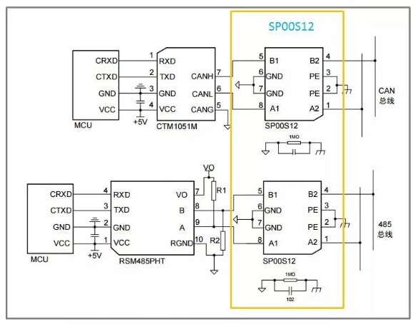 分立元器件方案雖然能夠提供有效的防護(hù),但是需要引入較多的電子器件,這也就意味著接口電路將占用更多的PCB空間,若器件參數(shù)選擇不合適易造成EMC問題。有沒有更簡潔的防護(hù)設(shè)計(jì)呢?答案是肯定的。可選擇引入專業(yè)的信號浪涌抑制器SP00S12,可用于各種信號傳輸系統(tǒng),抑制雷擊、浪涌、過壓等有害信號,對設(shè)備信號端口進(jìn)行保護(hù)。搭配ZLG的全隔離CTM或SC系列的隔離CAN收發(fā)器,如下圖。可極大程度的提升產(chǎn)品的集成度,于此同時(shí)極大程度的縮小開發(fā)周期。