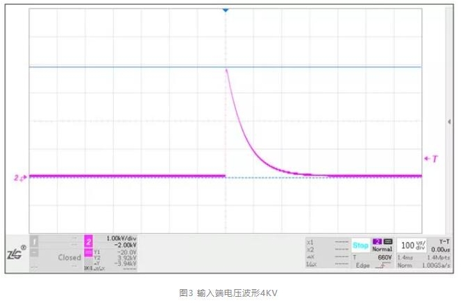 接下來做一下浪涌抗擾度測試,檢驗(yàn)一下浪涌抑制器是否滿足IEC61000-4-5±4KV防護(hù)要求,以共模浪涌測試為例,在SP00S12輸入端加載4KV、1.2/50μs浪涌電壓,在輸出端測試壓降已被降低至17.1V,波形圖如下。