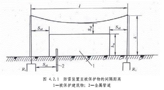5獨立接閃桿和架空接閃線或網的支柱及其接地裝置至被保護建筑物及與其有聯系的管道、電纜等金屬物之間的間隔距離(圖4.2.1),應按下列公式計算,但不得小于3m。